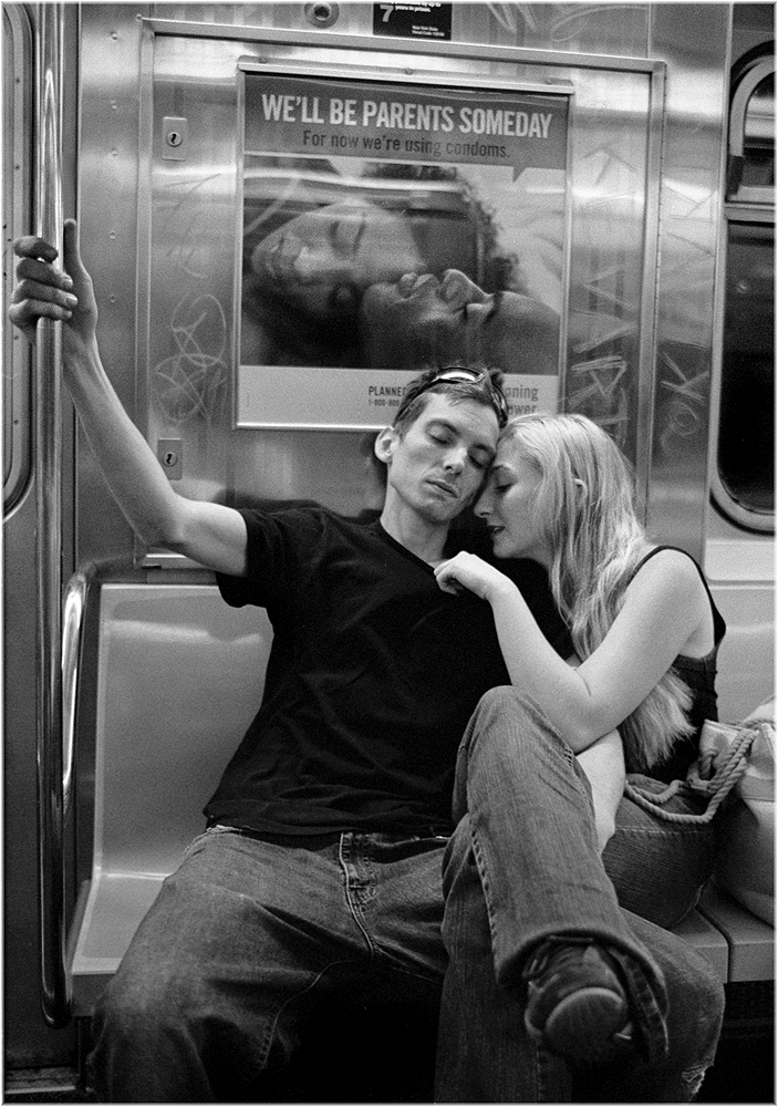 This might be the best subway picture that I’ve taken. Not because of the poster which of course is absurdly perfect. I had taken several shots of them and in one of the earlier images, they both were very aware of me and looked like they were uncomfortable. I really liked the composition though because of the way their arms were all over the place. By the time I took this frame, they had become oblivious to my persistent snapping and settled into a nice peaceful mood…This one is better.