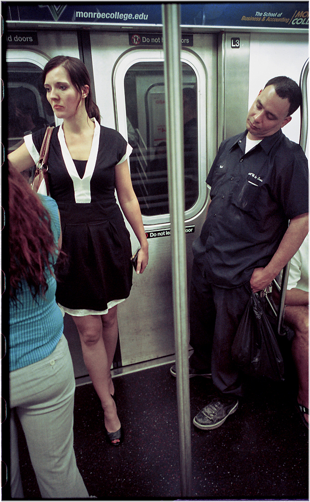 This might be the best subway picture that I’ve taken. Not because of the poster which of course is absurdly perfect. I had taken several shots of them and in one of the earlier images, they both were very aware of me and looked like they were uncomfortable. I really liked the composition though because of the way their arms were all over the place. By the time I took this frame, they had become oblivious to my persistent snapping and settled into a nice peaceful mood…This one is better.