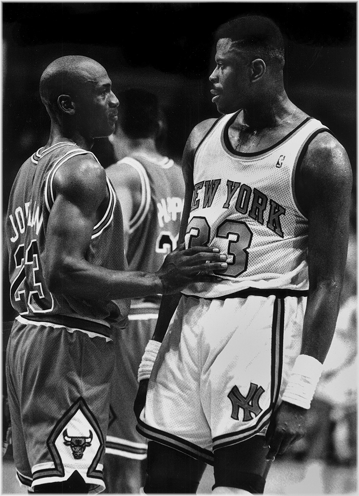 It was the right after the final game of the ’91 playoffs and the Bulls were about to win their first of six titles with Michael…I hocked my most sacred possessions to get a first row seat. Watching my Knicks eliminated was a drag but watching Michael was worth it (Sort of) The look on Patrick’s face is priceless as Michael is telling him there will be other years for him to win…There never was a way to get past Michael, and when the knicks finally made it to the finals in ’94, Olajuwon and the Rockets crushed Patrick’s dreams once again. Pat Reilly might have noticed that Johnny Starks was a bit off that night, but that’s another story…
