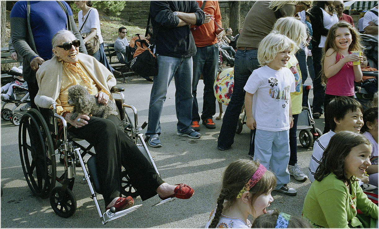 I tried to describe this picture to a friend of mine, but sometimes the essence of a photo is lost in translation. I was struck by the fact that this woman, who was clearly on her last legs was every bit as happy as the young kids who have their entire lives to look forward to. They were watching a juggling clown perform his tricks. I see too many old people sitting around this town waiting to die, and found this scene refreshing…