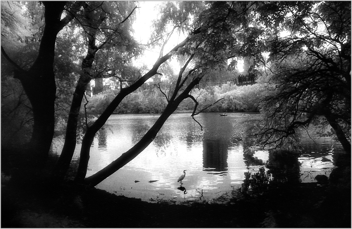 I like shooting infrared film, but it’s tricky and expensive stuff to work with. I only tried it a few times, but maybe down the road I’ll shoot some more…Having this Egret appear and do that thing it does with its leg, made this picture much better I think. There are actually more than Goldfish in the lake. Someone told me there are Carp as well, which is probably what this regal bird was waiting for…